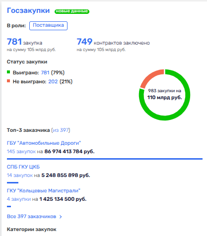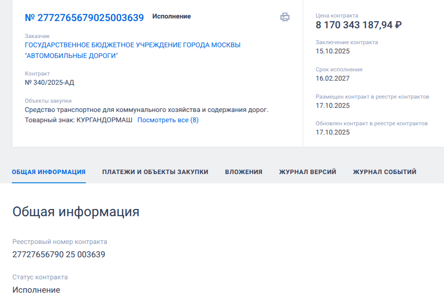 17 октября ГУП Москвы «Автомобильные дороги» подписало госконтракт на более чем 8,17 млрд рублей с единственным участником соответствующего тендера, то есть - по максимальной цене. При этом исполнителем тендера на поставку комбинированных дорожных машин производства АО «Курганский завод дорожных машин» (АО «Кургандормаш») стало отнюдь не само предприятие, которое даже не участвовало в тендере, а некое ООО «Меркатор Холдинг» - оптовик-перепродавец, нарубавший на госконтрактах 105 млрд рублей. Из них ГУП обеспечил почти 87 млрд рублей.